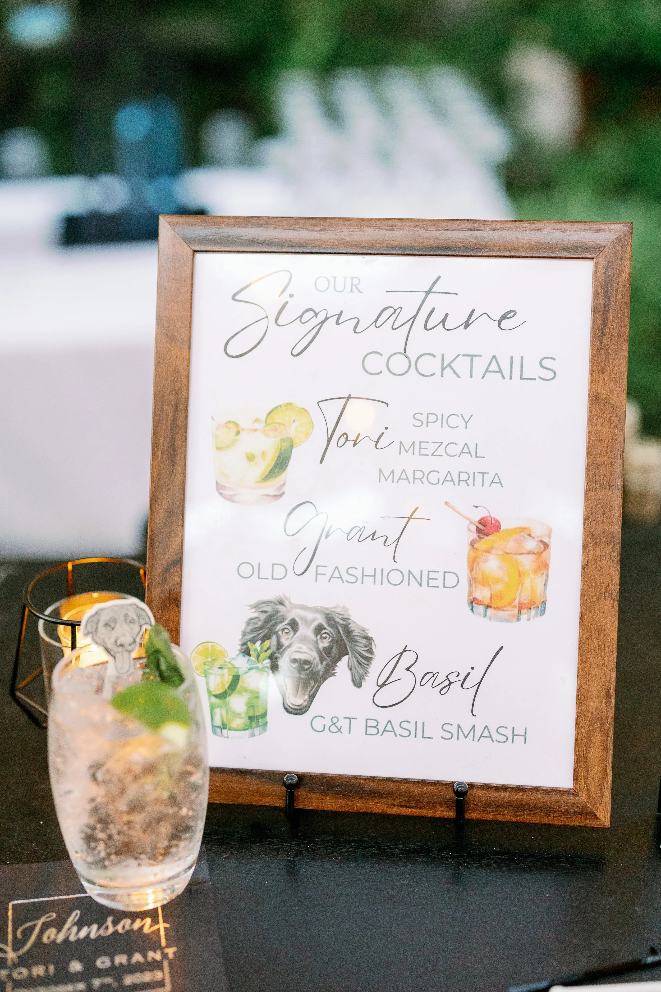 Tori + Grant Black tie wedding, Rancho Bernardo Inn, San Diego, CA. October 2023 welcome sign. wood base w/white and black acrylic. acrylic ceremony sign. bar menu w/signature cocktails. 2nd bar menu. seating chart. made from acrylic with fluted wood base.